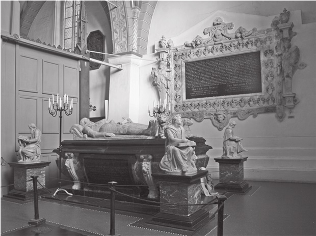 Гробница в Шлезвиге также не была пределом роскоши для датской аристократии. В 1566 году Биргитте Гёйе обратилась к Флорису с заказом на не менее величественную двойную гробницу с двумя парными эпитафиями для себя и покойного мужа, Херульфа Тролле, которую намеревалась поместить в их церкви на острове Херульфсхольм (илл. 10). Абель Скеель заказала весьма похожую гробницу из алебастра, черного и красного мрамора для себя и своего мужа, Нильса Ланге [Huysmans 1987: 112]. Форма гробницы Гёйе – Тролле весьма напоминает еще одну, заказанную в 1566 году Хейнрихом Ранцау для его отца, Йоханна. Ее выполнили из песчаника и установили в семейной часовне в городе Итцехо, в Гольштейне, которым Ранцау управлял в качестве Statthalter, то есть губернатора, при Фредерике II. Ее выполнил не Флорис, а Карстен Хаусманн из Бремена [Steinmetz 1991: 261–271, 690–692; Neville 2017]25. Поскольку они созданы практически в одно время, определить взаимосвязи между этими двумя гробницами тяжело. Тем не менее соперничество в кругу знати, вероятно, само по себе было напряженным, ведь каждый из этих памятников мог похвастаться бо́льшим количеством фигур и более сложными формами, чем гробница Фредерика I.