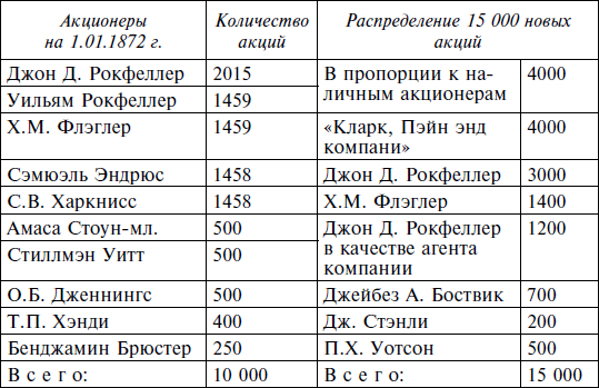 Таким образом, Рокфеллер владел в компании личным акционерным капиталом в 5016 акций, вкладом более чем 500 000 долларов по номинальной стоимости. Еще 1200 акциями он владел как агент для использования в будущих переговорах по вопросам слияния капитала. Несмотря на прибавление акционеров, прежнее ядро «Стандард ойл» – оба Рокфеллера, Флэглер, Эндрюс и Харкнисс – твердо контролировало организацию.