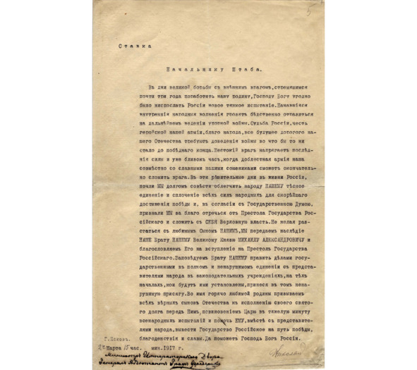 Копия Манифеста об отречении Государя Николая II от Престола (ГАРФ. Ф.601.Оп.1.Д 2100 а. Л.5)