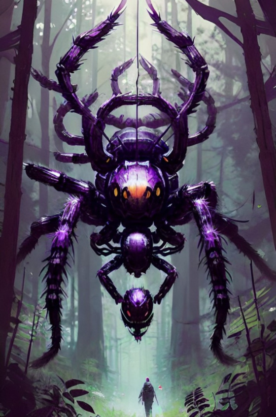 С деревьев по паутине к ребятам медленно спускался огромный паук. Оказавшись на земле, он застыл и уставился на непрошенных гостей. Два глаза горели белым цветом. Остальные сверкали, как красные угольки. На фиолетовом брюшке красовался геометрический орнамент. Паук двигался из стороны в сторону, то поднимая, то опуская свои мохнатые черные ноги. С острых хелицер падала слюна.