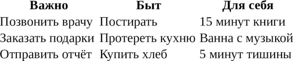 Пока однажды она не села с чашкой чая и не написала список – всего лишь три пункта на день. Один – важный. Один – бытовой. Один – для себя.