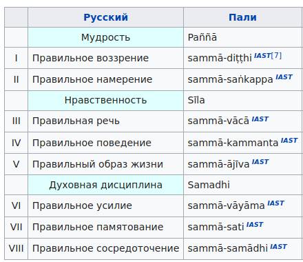 Благородный Восьмеричный Путь – путь, указанный Буддой, ведущий к прекращению страданий[30] и обретению наивысшего счастья/покоя с помощью аспектов мудрости, нравственности и духовной дисциплины. Состоит из восьми правил и называется поэтому «Благородным Восьмеричным Путём». Путь, по которому прошел сам Будда и могут следовать другие – и монахи, и миряне.