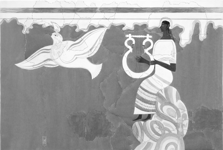 Against a ragged background, perhaps a rough, mountainous horizon, a poet – call him Homer – sits on a luminous, polychromed rock, a nightclub idea of a rock, dressed in a long striped robe with the sleeves of his overshirt coming almost halfway down his bare brown arms. His hair is braided, tendrils of it running down his neck and on to his back. He looks washed. Everything about him is alert, his eye bright and open, his body poised and taut, upright, ready. In his arms he holds a large five-stringed lyre, the fingers of his right hand plucking at those strings, which bend to his touch.
