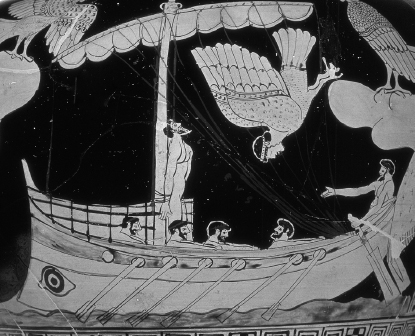 That meadow of death is the most desirable place any man could imagine. It is yet another island into which a man might long to sink and die. A dead calm falls on the sea. The men brail up the sail and then sit to their oars. The Sirens, just within shouting distance of the ship, taunt Odysseus as he passes. They can give him wisdom if he will come to them and listen. If he will let them, they will make him understand. They press on him the comfort and beauty of what they have to offer. They sing to him and Odysseus longs for them, his heart throbbing for them, as Fagles says, and with his eyebrows gestures to the crew to set him free. But the crew won’t respond. Deaf to all persuasion, they bind him tighter and row the ship through and past.