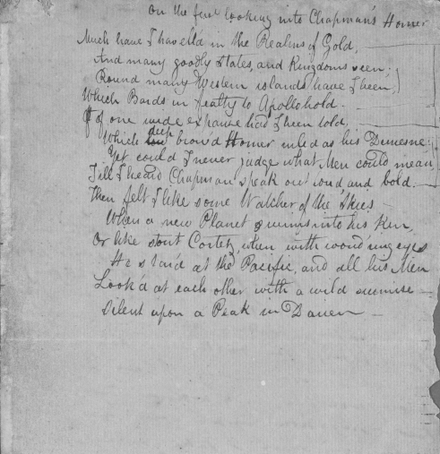 Clarke and Keats read Chapman together all night, and at six in the morning Keats returned to his Dean Street lodgings – his ‘beastly place in dirt, turnings, and windings’ – with Chapman looming in his mind. On the journey home across London he had begun to frame the sonnet which on arrival he wrote down. The manuscript, which he paid a boy to take over to Cowden Clarke that morning, so that it was on his breakfast table by ten o’clock, survives. The big, loopingly written words of that first morning text are not quite the same as what is usually printed.