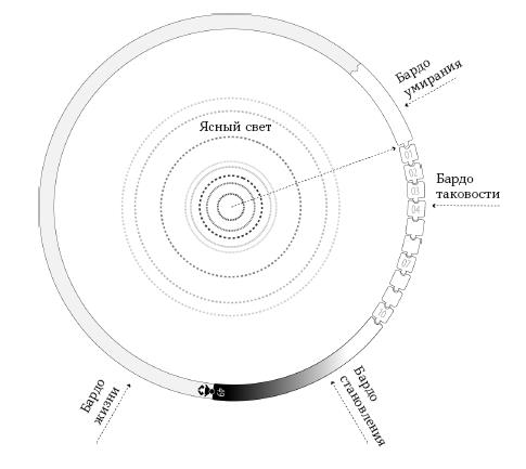 Чтобы понять различные состояния и модели поведения ума, буддийское учение рассматривает отдельные фазы цикла жизни. Он состоит из непрерывной цепи взаимозависимых мгновений, но может быть поделен на промежуточные состояния. Эти состояния, имеющие начало и конец, обозначаются термином «бардо», который в буквальном переводе означает «промежуток» или «между». Число таких бардо бесконечно, потому что все постоянно меняется. Вплоть до Просветления человек безостановочно переходит из одного состояния в другое. Чаще всего слово «бардо» используется для обозначения периода между нынешней жизнью и перерождением в следующую. Только Освобождение и Просветление – состояния, в которых осознающее постигает свою вневременную природу, – не являются бардо.