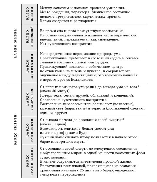 Учение Будды, высказывания Гуру Ринпоче, опыт буддийских мастеров и озарения других мудрецов, которые, возможно, практиковали буддизм в прошлых жизнях, – все это отвечает нашим самым глубинным чаяниям. Существуют вневременные, внеличностные уровни сознания, полные высшей радости, и есть методы, которым человек может научиться при жизни, чтобы с приходом смерти навсегда освободить ум от всякой боли. А если удастся узнать в возникающем в этот момент Ясном свете свою собственную природу – это принесет полное Просветление. Для этого используются медитации, задействующие тело, речь и ум и называемые по-тибетски пхова. Самая легкая из них и наиболее применимая описана в главе «Осознанное умирание». Те, кто владеет практикой пховы, при жизни меньше боятся смерти, а когда она наступает, автоматически переносятся на так называемые чистые (т. е. освобожденные и чрезвычайно радостные) уровни сознания, с которых невозможно упасть обратно.