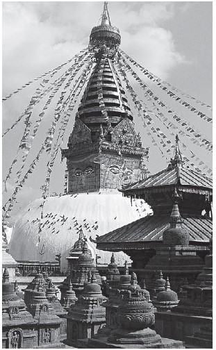 Повсюду в старой части Катманду, так же как и в соседних городах Патане и Бхатгаоне, нас окружало столько красоты и истории, что мы чувствовали себя как на поразительной выставке искусств. Особенно бросались в глаза бесчисленные ступы. Это буддийские святилища особых пропорций, содержащие реликвии. Подобно различным изображениям во многих храмах, они сооружены для того, чтобы активизировать врожденную природу Будды существ одним своим присутствием. Если вас не отпугнут от них уличные запахи и вид больных и попрошаек, то впечатление, оставшееся в уме, принесет в будущем состояния проницательности и радости.