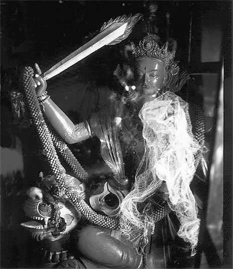 В одном винном погребе в Ницце у меня было очень необычное переживание. Пока я проводил медитацию на Шестнадцатого Кармапу для группы богатых спонсоров, поддерживающих знаменитого Паво Ринпоче, я вдруг перед собой увидел дракона. Он был метра два длиной, прозрачный, совершенно отчетливый. Дракон выглядел очень разгневанным и нападал, выпуская на меня клубы дыма. Ситуация была неоднозначной: мой французский оставляет желать лучшего, и перед такими важными людьми нельзя делать ошибок. Один клубок дыма уже полоснул меня по горлу, и я слегка охрип. Но самое главное заключалось в том, что представитель Будды не имеет права проигрывать. Если нападают на Учение, я борюсь до тех пор, пока опасность не устранена. Стараясь, чтобы другие не заметили, что происходит на том уровне сознания, на котором состоялось наше столкновение, я запускал в дракона град отсекающих ножей Черного Плаща и треугольных ритуальных алмазных кинжалов. Я превращал его тело в подушку для иголок, пока он, шипя, не уполз в трещину в скале. Лишь гораздо позже я понял, что это было моей ошибкой. Я принес чужеродное поле силы на его территорию, не подготовив его к этому. Как и все остальные формы, которые мне посчастливилось видеть, – Любящие Глаза, Черный Плащ и другие Будды, – этот дракон выглядел в точности так, как и должен выглядеть. Он как будто выпрыгнул из китайской детской книжки с картинками.