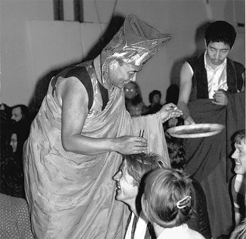 Врач вскрыл волдырь, и вскоре Кармапа показал, как Алмазный путь использует любую энергию. Садясь на трон, он преобразовал боль и болезнь в лучезарную улыбку, воздействие которой чувствовалось во всем зале. В конце он давал благословение. В фильме, который был тогда снят, видно, как после его прикосновения меня отбрасывает назад, а друзья меня подхватывают.