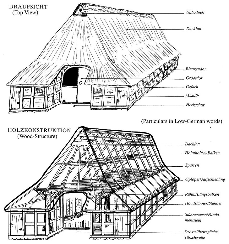 The older types as shown had developed into various designs of half-timbering structure, characteristically repre-senting even today forms of checker-works of the “Lower-Saxony-Farm-House”.