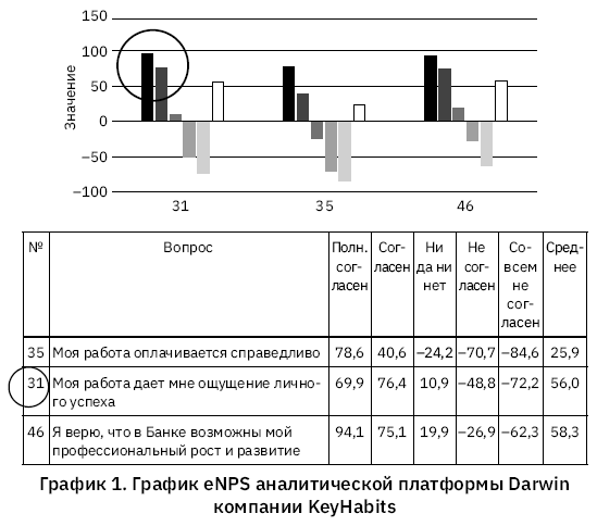 Оказалось, что вовлеченность сотрудников, которые отмечают, что имеют возможность заниматься на работе тем, что получается у них лучше всего, кардинальным образом отличаются от тех, кто отмечает противоположное. У этих людей показатель вовлеченности (Employee Net Promoter Score – от англ. готовность сотрудника рекомендовать работу в этой компании) составляет в среднем по России +60 %, в то время как показатель вторых – минус 60! (см. график). Аналогичным образом обстоят дела с теми, кому работа дает ощущение личного успеха – вовлеченность согласных с этим утверждением составляет 96,9 %, в то время как вовлеченность несогласных упала до –72,2. Фантастическая разница, не правда ли?