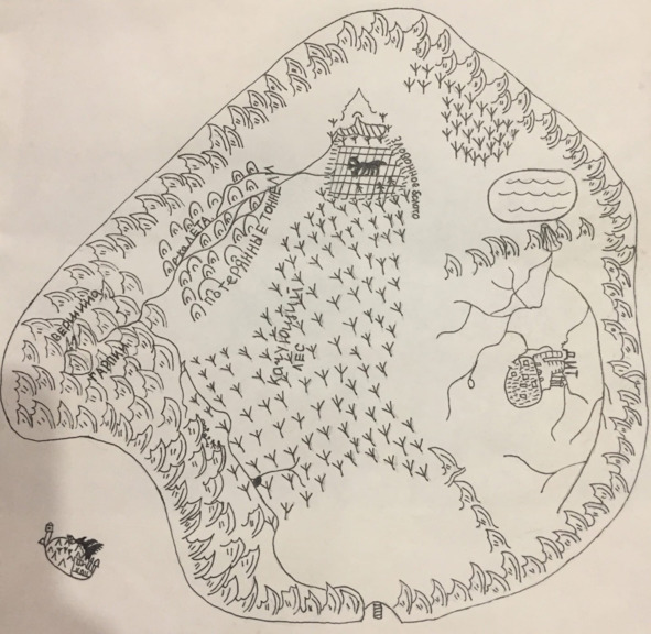 Когда все приготовления были закончены, я краем глаза заметил, что девушка смотрит в зеркальце и поправляет волосы вокруг рога. Раньше это зрелище вызвало бы у меня отвращение, но сейчас это показалось немного милым. Заметив мой взгляд, девушка быстро убрала зеркальце и сделала вид, что ничего не было. Я перевел глаза на Лиздейко, он уже потушил костер, после чего достал какую-то бумажку. Развернув ее и бережно уложив на камень, он подозвал нас. Это оказалась карта, на ней было отмечено наше местоположение, мы находились чуть ниже вершины Гарпии. Здесь было отмечено многое: сама земля представляла собой остров, покрытый горами и пустыней, лесами и полями, здесь было все, что могло быть на Земле. Даже города и замки имели место быть. Я спросил: «А кто это построил?» Не могли же все сооружения, оружие и даже эти существа появиться сами собой.