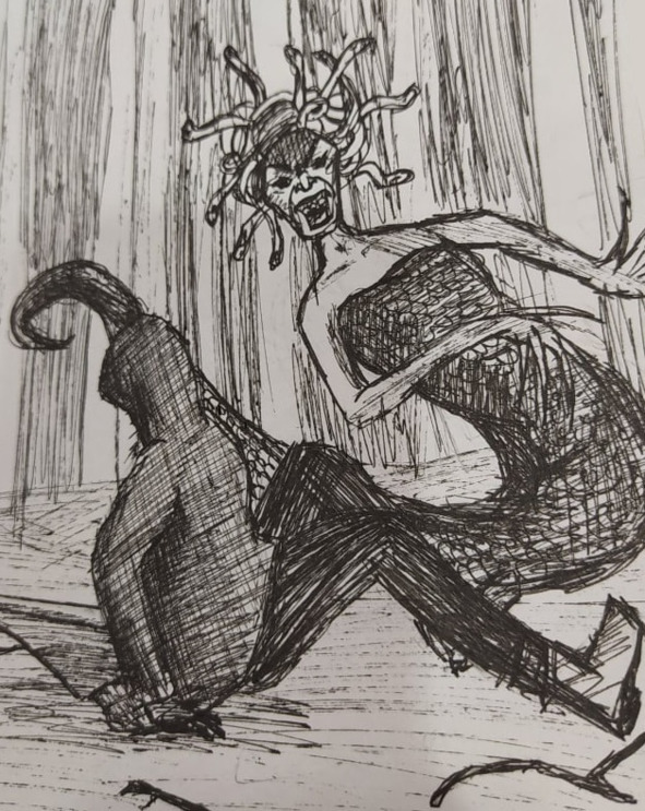 Доплыв до большого камня, который разделял реку надвое, мы спрятали плот и двинулись дальше. Ходить по земле было наслаждением. Скалы, какими бы теплыми они ни были, не способны давать столько радости, сколько ее дарят обычные земля и трава. Я решил больше не надоедать вопросами своим спутникам, а просто наслаждаться видом. К ночи мы, наконец, добрались. Перед нами раскинулись высокие голые деревья. Все были немного измотаны, особенно я. Поэтому мы сразу начали разбивать лагерь. После этого Катя взяла лук и пошла в лес на охоту. Язычник вызвался развести костер, а я, не зная чем еще заняться, пошел собирать хворост. Лес выглядел немного зловеще, а голые деревья никак не прибавляли энтузиазма. Со всех сторон слышались шорохи, появилось чувство, что за мной следят. Я понял, что нужно уносить отсюда ноги. Подобрав охапку дров, я развернулся и пошел в обратном направлении. Лес не прекращался. Я стал видеть тени. Они шли за мной по пятам. Я начал бежать, пытаться как можно быстрее вернуться к своим и упал. Одна маленькая веточка решила иначе, она зацепила ногу, отказываясь ее отпускать, подобно ребенку, которому купили новую игрушку. Только игрушкой был я. Резко выдернув ногу из объятий ветки, я прыжком встал на ноги и достал Слезу. Все вокруг меня озарилось небольшим, но пронизывающим светом. Я услышал знакомое шипение и узрел своего врага в лицо. На этот раз я сразу понял, что у них на головах не парики, а самые настоящие змеи. Они шипели и двигались, приковав ко мне свои маленькие черные глаза. Женщин было несколько, они смотрели на меня, плавно пытаясь окружить. Я крикнул: