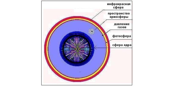 – давление в десятки миллионов атмосфер, тепловой зоны, компенсируется, противодействующей всасывающей силой и в сферическом зазоре разностью смещений зон плазмы, механизмом вакуумного гидроавтомата тахоклина. Температура миллионов градусов, как изложено вашим изобретателем, в трактате, находится в мантии в зоне термоядерной топки инфракрасного излучения – ниже слоя фотосферы. Тепло и свет, известно из наблюдений, распространяется против силы тяготения – наружу, их взаимодействия с холодным теневым пространством, строго сбалансированы, где происходит поглощение тех горячих компонент, посредством, всасывания их избыточной части внутрь полости объема. Звезда – диполь с полюсом холода криосферы и оболочкой слоя высокотемпературной плазмы – термосферы.