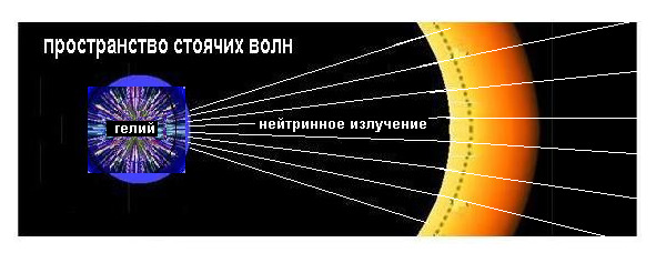 Радиальное схождение к центру фокального ледяного объема, единственно проникающего внутрь, сквозь горящую кору, частиц нейтрино – первичного космического излучения, сходящегося, в прямой связи, имеет, в обратной связи, при совпадении отдельных лучей самих с собой, утоненные каналы стоячих волн. Их каналы служат для выхода, рождающегося, всепроникающего гелия и наименьшего калибра элемента вещества, из всех атомов периодической таблицы – водорода. Изменение в сторону повышения температуры криоплазмы (флюида) в фокальном ныне объеме, аналогично процессу для нашего светила.