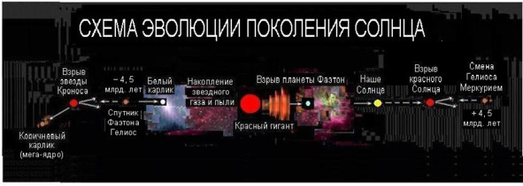 В Схеме эволюции Солнца (рис., 3) встреча Красного гиганта с Фаэтоном. На представленной панораме, условно показан удаленный объект Солнца, расположенный в конце рисунка. На самом деле протозвезда и новая звезда, сменяют «на посту» друг друга в одном месте. За Белым карликом – будущим Солнцем так же расположатся, как и ранее, смещая друг друга, вереница внешних планет гигантов. Представления о протозвездных поколениях, есть в разделе Главы 3.