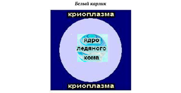 Вследствие, ускоренного разлета взрывом звезды и выброса ударной волной мега-ядра, связанного с преданием имени Кроноса, в области крайне разреженного пространства, образовался из слипшейся между собой ледяной пыли ком – Белый карлик. На ранней стадии образования ледяного кома, холодная звезда Белый карлик могла захватить в свое ядро первую, ближайшую от прежнего положения центра планету. (См., ниже раздел: -«Биллиардный» шар космического масштаба). Криоплазма возникла на старте нового цикла рождения Солнца, охлажденной вновь среды плазмы, до абсолютной, минусовой температуры, но не затвердевшая, а в центре вакуумной «ямы» сгустившаяся субстанция, конденсировалась до жидкого состояния. Полюс, со знаком минус «Белого карлика» обновил ослабевшую силу противодействия своего «потеплевшего» предшественника. Тело последнего, в контексте версии, за истекший срок миллиардов лет переполнилось положительными нейтронами, зарядов, приходящих и прошивающих среду тверди треками радиоактивного излучения.