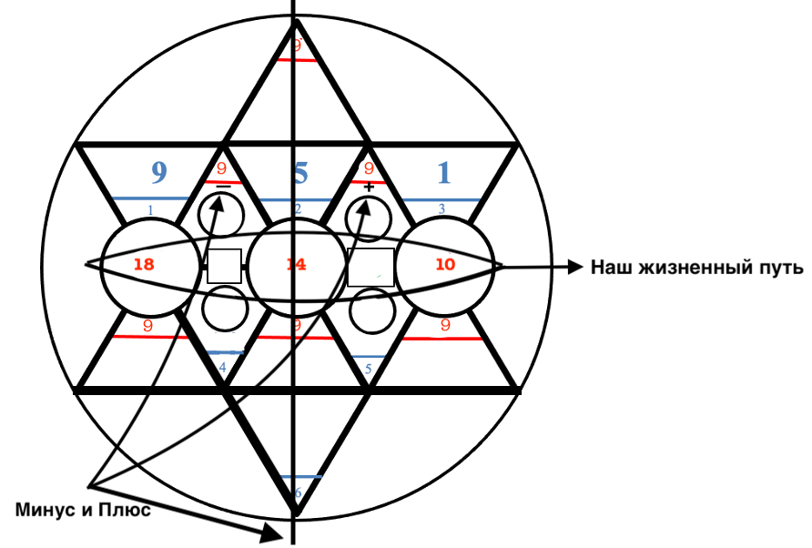 Теперь вам надо рассчитать круги в центре и вставить цифры в них. Если ранее обозначались как Основной урок года и т. д., то здесь они обозначатся как жизненный путь и будут прокладывают дорогу к основным цифрам. Они называются «Жизненный путь», и будут называться просто «Сценарий года», «Урок года», «Экзамен года».