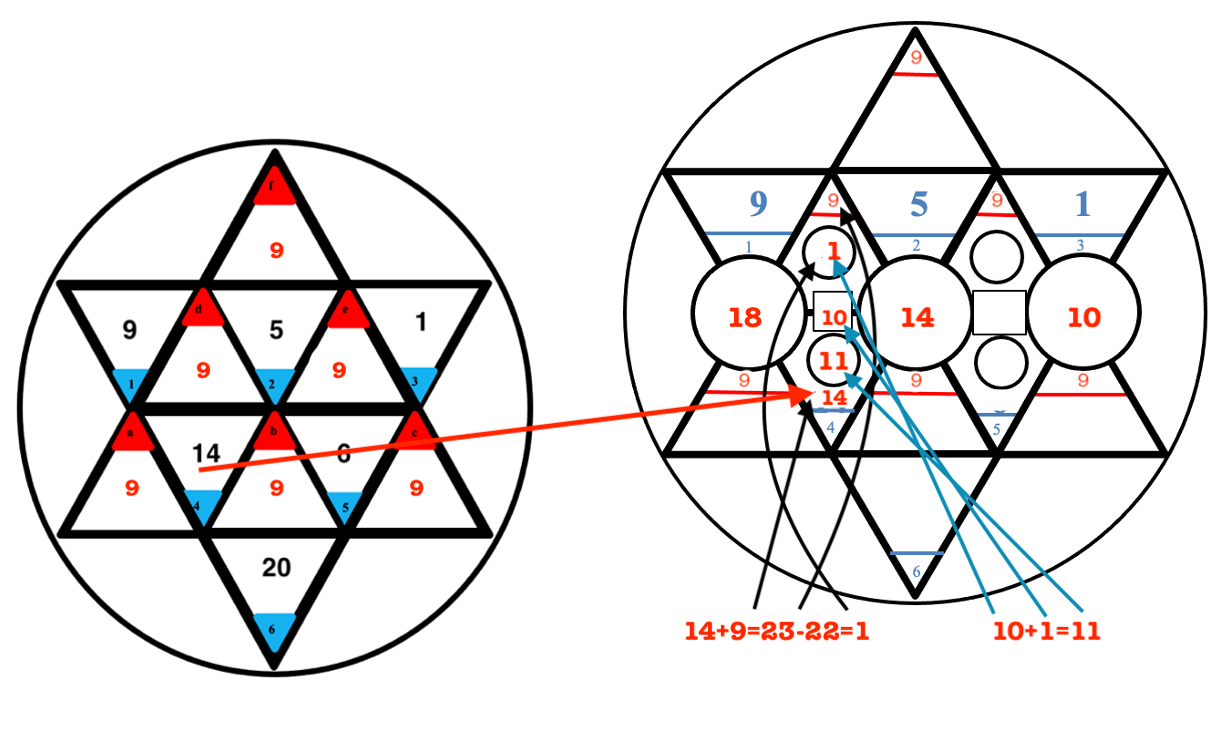 1. Берем 4-й треугольник (14) и + с архетипом года (9), и получаем (23-22=1) – (слабое место).