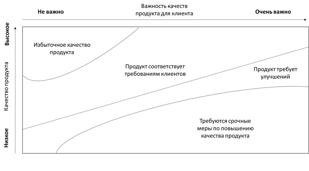Вместе с тем, здесь стоит отметить важность баланса между действительными ожиданиями клиента и усилиями, которые юрист готов вкладывать в совершенствование юридического продукта. Об этом мы подробно поговорим ниже, в разделах о клиентоориентированности юридической службы и о лидерстве в юридической функции, однако здесь я бы хотел зафиксировать следующую важную мысль. Руководитель юридической функции, как и любой другой менеджер, организующий работу по созданию продукта для клиентов, должен различать такие его качества, которые не слишком важны для клиента, хотя кажутся немаловажными для юристов (область «Избыточное качество продукта», приведенная в диаграмме ниже), а также такие, которые для него критичны и ради которых он обращается за услугой (области «Требуются срочные меры по повышению качества продукта» и «Продукт требует улучшений»). К первым относятся, например, форма правового заключения, детальность ссылок на нормативные акты в рекомендации, обучающие материалы, в которых нет потребности, дорогой офис и так далее. После выполнения минимальных требований дальнейшие инвестиции в улучшение этих характеристик юридического продукта не влекут повышение его востребованности или улучшение оценки со стороны клиента. Ко второй группе качеств юридической услуги относятся такие из них, которые должны быть безупречны. Иногда это срок ответа на запрос, иногда ясность изложения позиции, иногда это просто выход за рамки технического задания и выполнение дополнительной юридической работы. Если руководитель юридической службы (юридической фирмы) умеет эти качества разделять, он не ошибется в том, на что следует обращать приоритетное внимание для повышения оценки своей работы.