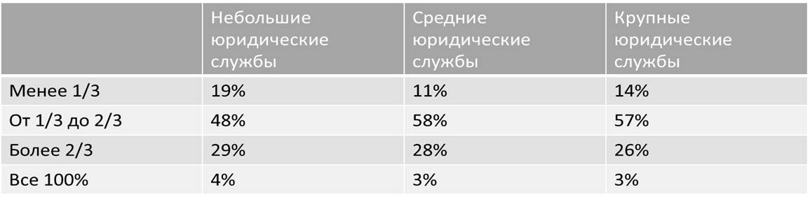 По данным опроса Thomson Reuters6, в 2019 году распределение задач между внутренними и внешними юристами выглядело следующим образом:
