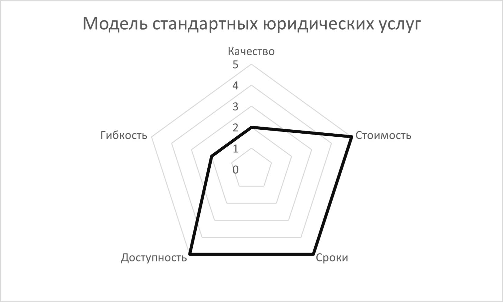 В первом случае мы видим юристов, дающих быстрые юридические решения. Как правило, это не сложные продукты, предполагающие большой уровень стандартизации, не слишком высокие требования к квалификации персонала (поскольку он в большей части действует по шаблону или чек-листам), не очень глубокие по степени проработки документы и заключения. Перечень услуг, предоставляемых данной фирмой, достаточно ограничен, гибкость и способность подстроиться под клиентский запрос – ниже среднего. Но эта фирма, безусловно, выигрывает в цене, а по срокам оказания услуг и по доступности сервиса ей нет равных. Это модель стандартных юридических услуг.