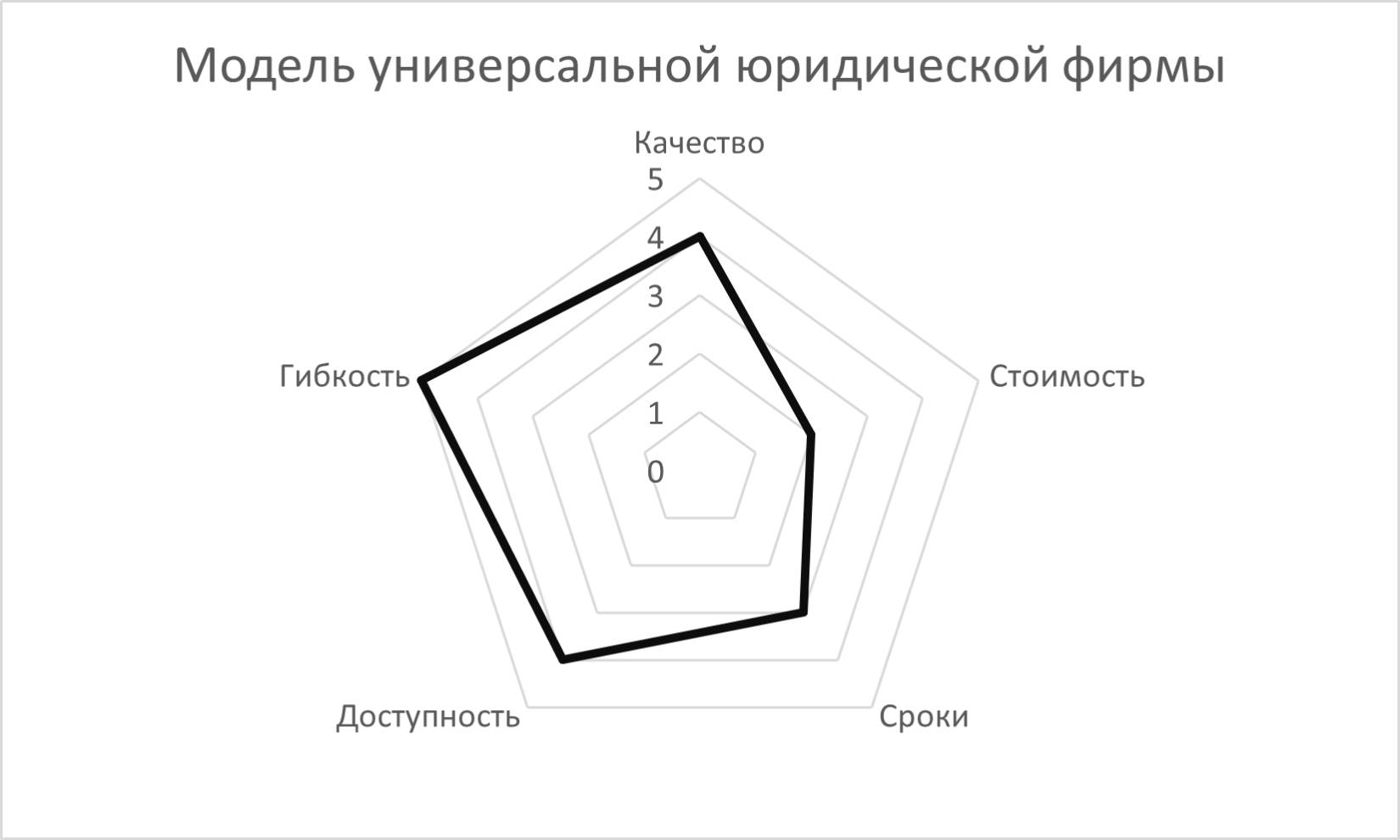 Наконец, рассмотрим крупный холдинг, в который входят многочисленные производственные активы. Юристы такой компании сталкиваются с широчайшим спектром правовых вопросов. Начиная от сделок M&A, которые совершаются тем чаще, чем больше активов у компании, заканчивая правовой поддержкой по уголовным делам, связанным с охраной окружающей среды, или экспертизой законопроектов в рамках деятельности РСПП и ТПП. Также есть вопросы финансирования (еврооблигации, проектное финансирование, банковские кредиты), продажи продукции, закупки оборудования, есть огромный массив отношений, связанных с юридической поддержкой логистической кооперации, есть ФАС, есть Ростехнадзор, есть американские санкции…. Достаточно сложно найти отрасль права, с которой юристы крупного российского холдинга не сталкиваются относительно часто. Это создает потребность в развитии самых разных компетенций у такой юридической службы. Поэтому гибкость, то есть широта спектра вопросов, по которым оказывается поддержка, в данном случае является наиболее важным операционным приоритетом. При этом высокая материальность разрешаемых вопросов не дает возможности пойти на компромисс с качеством создаваемого юридического продукта. Поэтому договоры, заключения, судебные документы, выпускаемые юристами крупной юридической функции, не сильно уступают по своему качеству продуктам, создаваемым «бутиковыми» юридическими фирмами. Это, безусловно, отражается и на стоимости юридической функции. Она достаточно высока. Что менее остро для больших компаний – это сроки. Высоко материальные вопросы обычно не решаются слишком быстро. Поэтому трехдневный срок ответа на несложный юридический вопрос или многомесячные переговоры по сделке о создании совместного предприятия для крупной организации – в порядке вещей. Это модель универсальной юридической фирмы.