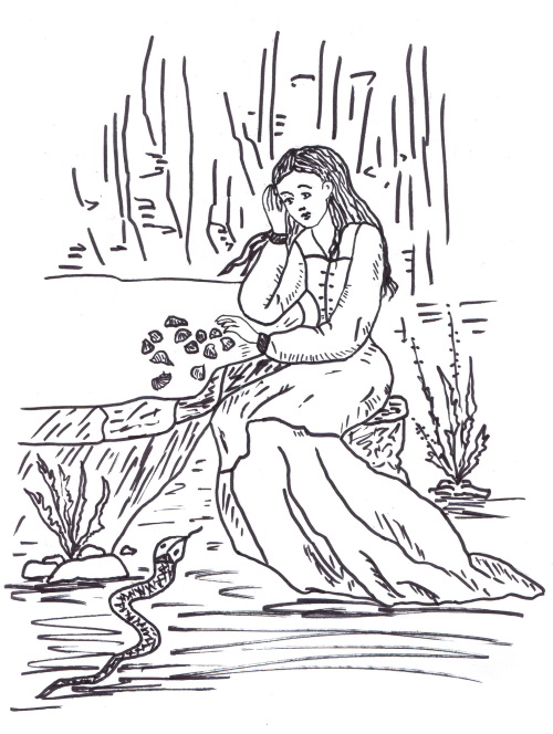 Я узнал всё, что мне требовалось, и вскоре нашёл крепость, в которой томилась Тея и куда проник, находясь в облике змеи. Девушка сидела за столом и складывала узор из морских ракушек. Увидев меня, она не испугалась, а удивлённо сказала: «Глупая змея! Зачем ты заплыла сюда? Уплывай скорее! Здесь не место для вольной твари».