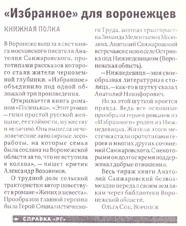 Весь тираж книги Анатолий Санжаровский безвозмездно передал своим землякам через районные и городские библиотеки Воронежской области.