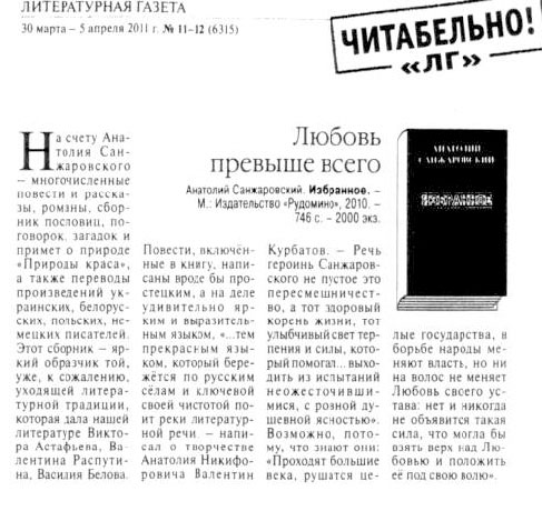 О моём однотомнике «Избранное» (Москва, 2010), куда был включен и «Оренбургский платок», о достоинствах моей прозы писала и «Литературная газета» на полосе «ЧИТАБЕЛЬНО! ЛГ» («Литгазета», №№ 11–12 от 30 марта – 5 апреля 2011, страница 7). Речь о рецензии «Любовь превыше всего». Как информировала «Литературка» на первой странице 26 апреля 2011 года, «гриф «Читабельно!» ставился только на книги, противостоящие рыночной стихии, защищающие честь и достоинство русской и мировой литературы».
