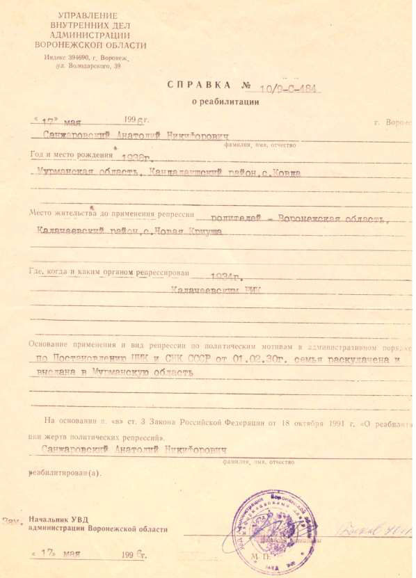 И уже целые семьи и деда, и отца ночью вытолкали с родной воронежской сторонки за Полярный круг. На лесоработы.