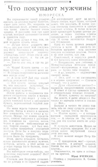 Вы спрашиваете, какой подарок сделать на Восьмое марта? Конечно, совет дать легко. Но, опираясь на собственный опыт, должен сказать, что такие советы бывают очень вредны. Я расскажу вам про один случай, который произошел со мной в прошлом году.