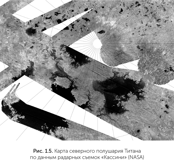 Титан уникален среди всех спутников тем, что он имеет плотную атмосферу. Кроме того, Титан – единственное кроме Земли тело Солнечной системы с озерами и реками на поверхности (рис. 1.5). Правда, при температуре −170 °C эти озера и реки состоят из жидких углеводородов (метана и этана) и текут по скалам из водяного льда. Атмосфера Титана состоит из азота с примесью метана. Под действием ультрафиолета в верхних слоях атмосферы образуются сложные углеводороды, которые создают желтую дымку, скрывающую поверхность спутника.