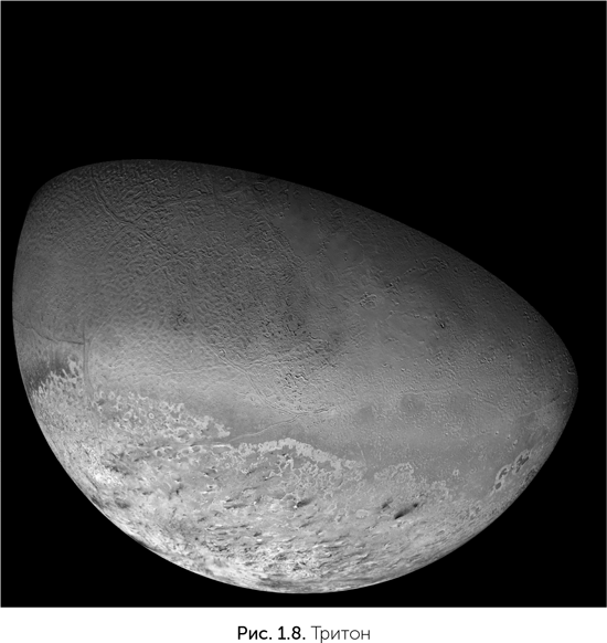 В системе Нептуна есть один крупный спутник – Тритон (рис. 1.8.) диаметром 2700 км (несколько меньше Луны), семь мелких внутренних спутников, очень близких к планете, и пять удаленных от планеты мелких нерегулярных спутников. Тритон обращается вокруг Нептуна в обратном направлении, как нерегулярный спутник, хотя его орбита практически круговая и наклонена лишь на 24 градуса относительно экватора планеты. Его плотность 2,07 г/м³ свидетельствует о большой доле каменных пород по сравнению с другими спутниками Урана и Нептуна. Состав Тритона и характер его орбиты заставляют предположить, что раньше Тритон был самостоятельной карликовой планетой, вроде Плутона, и был захвачен Нептуном при сближении. На поверхности Тритона заметны следы тектонической активности и гейзеры, извергающие азот. Активность этих гейзеров поддерживает разреженную азотную атмосферу, ее давление примерно в 50 000 раз ниже давления атмосферы Земли.