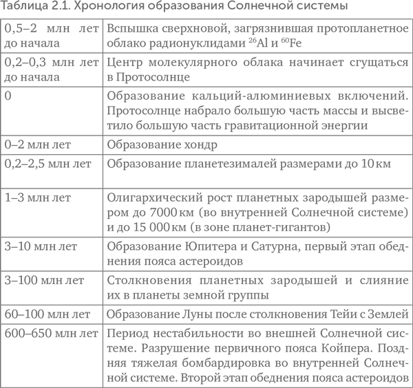 Самые древние твердые тела Солнечной системы, кальций-алюминиевые включения, тоже входят в состав метеоритов, но они крупнее, до миллиметра в размере, и в их составе есть и менее тугоплавкие материалы. Возраст всех кальций-алюминиевых включений, определенный с высокой точностью уран-свинцовым методом, одинаков и составляет 4568 млн лет. Момент образования кальций-алюминиевых включений принимается за точку отсчета существования Солнечной системы (табл. 2.1).