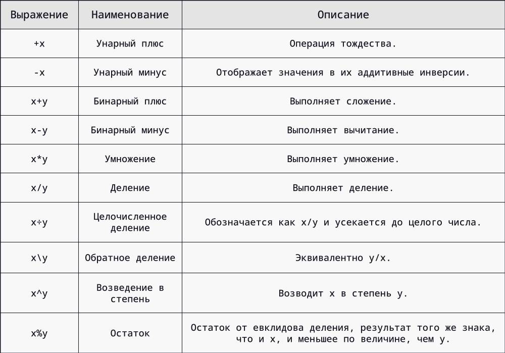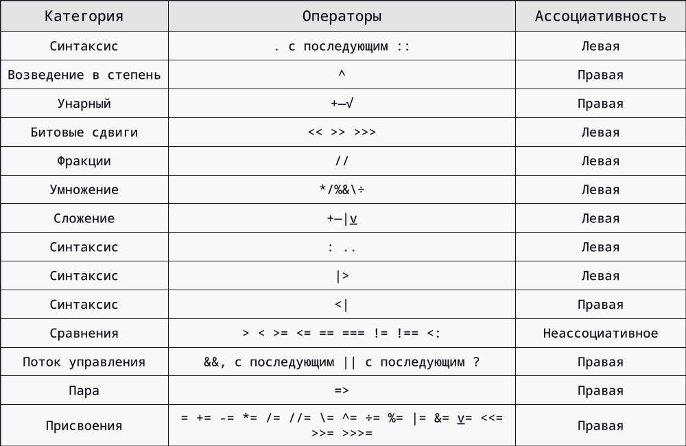 Julia применяет следующий порядок и ассоциативность операций, от высшего к низшему: