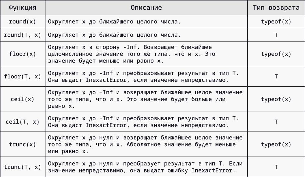 В таблице ниже показаны функции округления Julia: