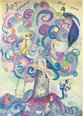 «Древо познаний»: работа выполнена группой подростков в соавторстве с психологом. Основная цель занятия – объединение и сплочение группы. В процессе совместного творчества ребята создавали эскизы деревьев, знакомились с азами колористических приемов в выборе цветовой палитры.