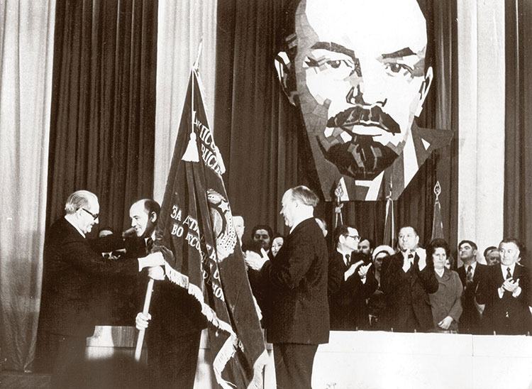 Переходящее красное знамя Ставропольскому краю в лице Горбачева вручает второй человек в партии – ее идеолог Михаил Суслов