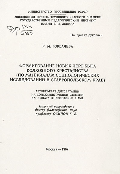 В диссертации «Формирование новых черт быта колхозного крестьянства», которую Горбачева защитила в 1967 году, она заведомо приукрашивала этот самый быт, упрекает ее Казначеев. Со стороны бывшего партработника этот упрек сам по себе еще более лицемерен: иначе никто не позволил бы ей защититься. Дисциплина «социология» в те годы в СССР была под большим подозрением, что затрудняло защиту (знаю это по докторской моего отца).