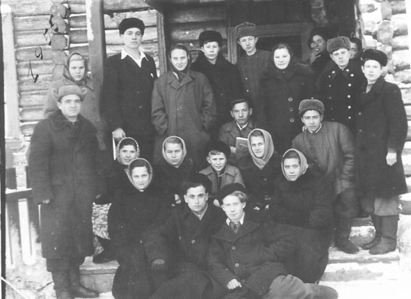 Благодаря его таланту и инициативе мы заняли к Новому 1956 году первое место на техникумовском смотре по художественной самодеятельности. В моём домашнем альбоме сохранилась фотография части нашей группы первокурсников на крыльце клуба перед репетицией.