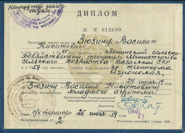 У меня уже нарастала внутренняя тревога за сдачу предстоящих выпускных госэкзаменов, поэтому пришлось заставить себя садиться за подготовку к ним и меньше времени оставлять для разных молодёжных развлечений. В результате все экзамены мне посчастливилось сдать на отлично, и за это получить от профкома бесплатную путёвку в дом отдыха «Ишимский» в Тюменской области. 25 июля 1959 года нам торжественно вручили дипломы по специальности «Младший агроном».