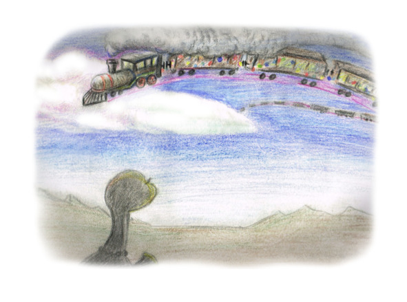Когда Фифи крепко спала, ей приснился такой удивительный сон. Будто она проснулась, поднялась с постели и вышла на крыльцо. Мир погрузился в сон, только древние жабы квакали в канавах и ночные экзотические птицы вели свои негромкие беседы. Кругом было темно. Только яркий диск луны сиял на небе, рассеивая вокруг себя по небу белый свет. Вдруг вдали, среди облаков, превратившихся в темноте в причудливые тени, что-то сверкнуло. И Фифи увидела, как к ней приближается и спускается прямо с неба светящийся разноцветными огоньками поезд – Сказочный экспресс. Это был настоящий огромный паровоз. У него даже была на крыше труба, из которой периодически вырывались гудки и разноцветные клубы дыма со сверкающими блестками. Эти блестки кружились в воздухе, создавая поистине волшебную атмосферу.