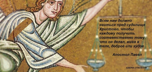 И потому ревностно стараемся, водворяясь ли, выходя ли, быть Ему угодными, ибо всем нам должно явиться пред судилище Христово, чтобы каждому получить соответственно тому, что он делал, живя в теле, доброе или худое. Итак, зная страх Господень, мы вразумляем людей, Богу же мы открыты, надеюсь, что открыты и вашим совестям. Не снова представляем себя вам, но даем вам повод хвалиться нами, дабы имели вы что сказать тем, которые хвалятся лицем, а не сердцем. Если мы выходим из себя, то для Бога, если же скромны, то для вас (2Кор.5:1—13).