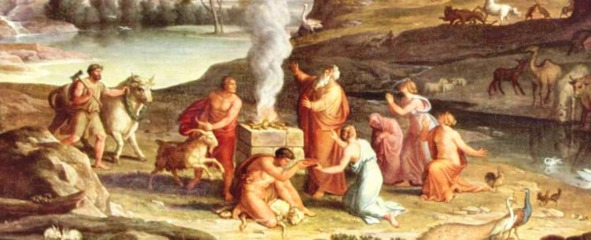 И привел Моисей овна для всесожжения, и возложили Аарон и сыны его руки свои на голову овна, и заколол его Моисей и покропил кровью на жертвенник со всех сторон; и рассек овна на части, и сжег Моисей голову и части и тук, а внутренности и ноги вымыл водою, и сжег Моисей всего овна на жертвеннике: это всесожжение в приятное благоухание, это жертва Господу, как повелел Господь Моисею (Лев.8:18—21).
