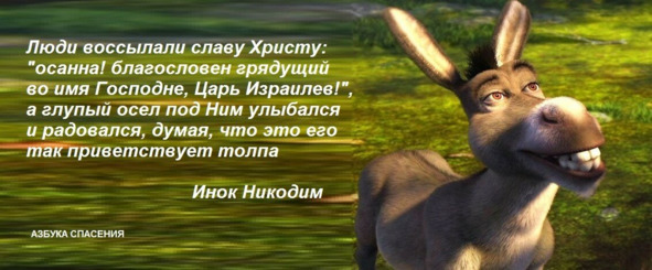 Архимандрит: «Напрасно хвалите меня, я всего лишь осел, на котором въезжал Господь в Иерусалим».Люди воссылали славу Христу:, а глупый осел под Ним радовался, думая, что это его так приветствует толпа. осанна! благословен грядущий во имя Господне, Царь Израилев!