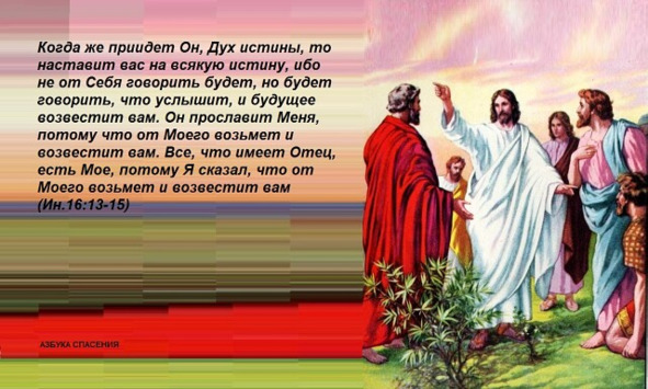 Еще многое имею сказать вам, но вы теперь не можете вместить. Когда же приидет Он, Дух истины, то наставит вас на всякую истину: ибо не от Себя говорить будет, но будет говорить, что услышит и будущее возвестит вам. Он прославит Меня, потому что от Моего возьмет и возвестит вам. Все, что имеет Отец, есть Мое, потому Я сказал, что от Моего возьмет и возвестит вам (Ин.16:12—15).