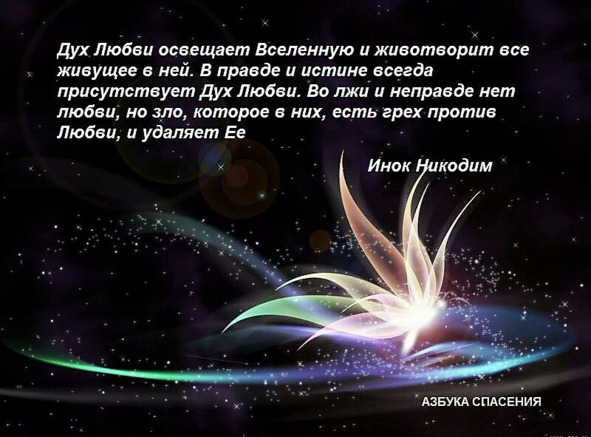 Дух Любви проницает Вселенную и животворит тварей, непрестанно приводимых в Бытие. В правде и истине всегда присутствует Дух Любви. Во лжи и неправде нет любви, но зло, которое в них, есть грех против Любви и удаляет Ее. Затемненное страстями и грехами сердце, не ощущает Духа Любви и вечной жизни, но пребывает во тьме неведения и заблуждения. Любовь Божия рождается в сердце человеческом от исполнения заповедей на пути искания Истины (Христа):