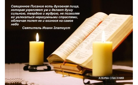Телесная пища для поддержания наших сил то же, что чтение для души. Оно есть духовная пища, которая укрепляет ум и делает душу сильною, твердою и мудрой, не позволяет ей увлекаться неразумными страстями. В Священном Писании излагается все, что должно делать и чего не должно. Оно есть одно из главнейших средств для Для того дано наставление Писаний, чтобы совершен был «Божий человек». Слово Божие приводит блуждающий ум в собранность. научения, для обличения, для исправления, для наставления в праведности (2Тим.3:16).